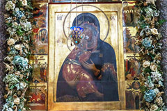В храме Сретения Владимирской иконы Божией Матери хранится список Владимирской иконы, которой благословил обитель старец Иоанн (Крестьянкин), частицы мощей преподобной Марии Египетской, св.Николая Чудотворца, св. Иоанна Златоуста, Василия Великого, преп. Серафима Саровского. В крипте храма находится точная копия Туринской плащаницы в натуральную величину (негатив и позитив), освященная Патриархом Алексием II как Нерукотворный образ Спасителя. В соборном храме покоятся мощи Илариона Троицкого, бывшего настоятеля монастыря.