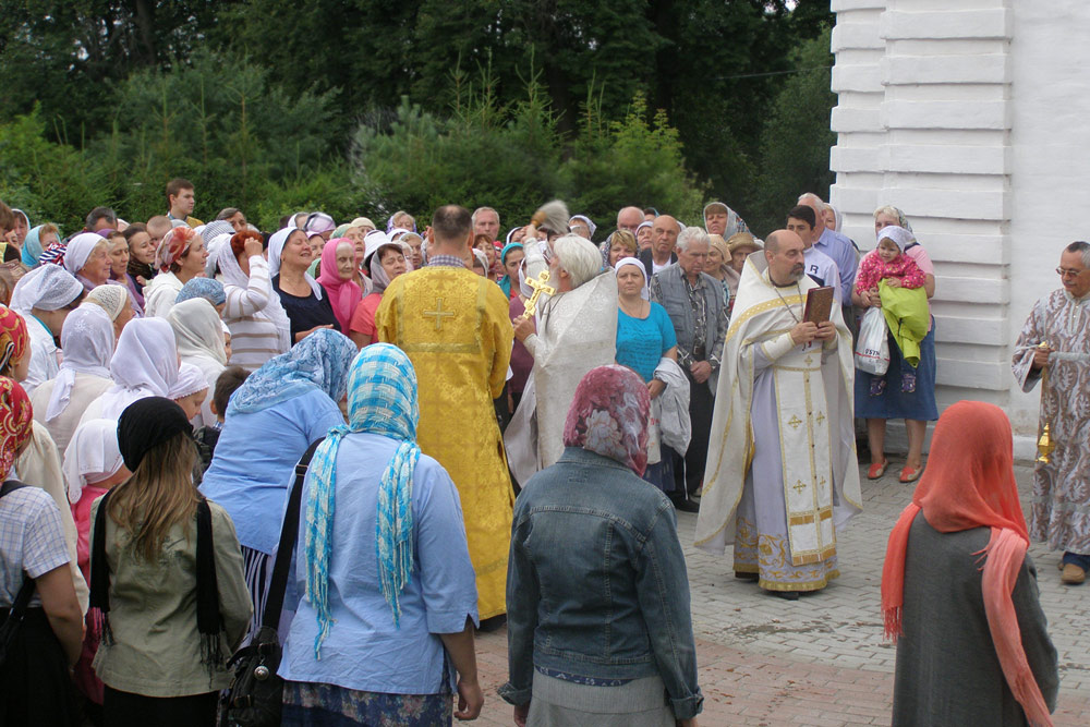 Несмотря на то, что день рабочий, народу в храме больше, чем в воскресенье. Многие пришли из других приходов. Были и москвичи. От этого было ощущение выходного, праздничного дня. Погода, на радость, прохладная и пасмурная. Вот-вот и хлынет дождь.
