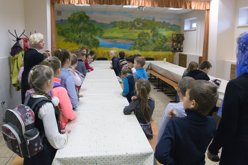 После предварительного собрания на прошлой неделе, родители в это воскресение привели своих детей на первые занятия - воскресная школа начала свою работу. Библиотечный кабинет уже был открыт с утра - там выдавали учебные пособия тем, кто не успел приобрести его на собрании. В десять утра прозвенел первый звонок на урок Закона Божьего - ученики первого и второго классов заняли свои места в классах. У кабинета ИЗО, несмотря на начало урока, толпились родители, желающие и посмотреть, и записать своих детей в художественный класс. В столовой уже готовы были накормить первых маленьких посетителей.