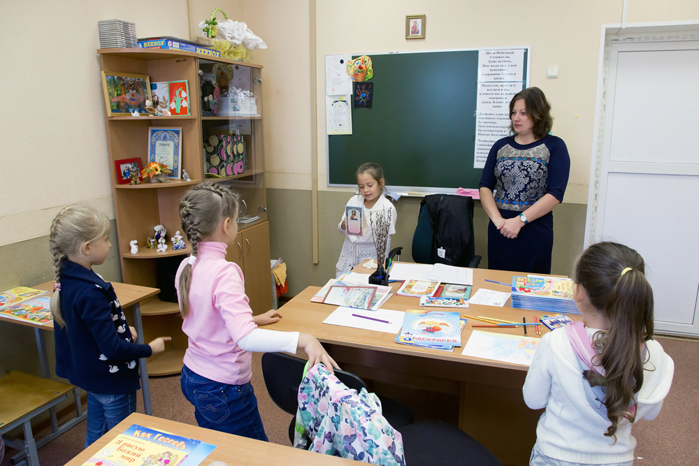 Когда младшие классы после урока спускались в столовую на полдник, в коридоре уже толпились дошкольники. Усевшись за парты, на которых лежали пособия, карандаши, бумага, детки познакомились со своим педагогом. Урок познания Божьего мира для них начался.